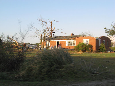My home is located less than a quarter mile from the tornado's path. Bella and I were out "visitin'" as people in the South do. Bella had to use the bathroom, so we made a pit stop before heading down St. Andrews toward my mama's store for one last visit. I was standing with her in the yard remarking on the wind when a black cloud moved in, bringing hail and vicious winds. We ran inside about the time the power went out.